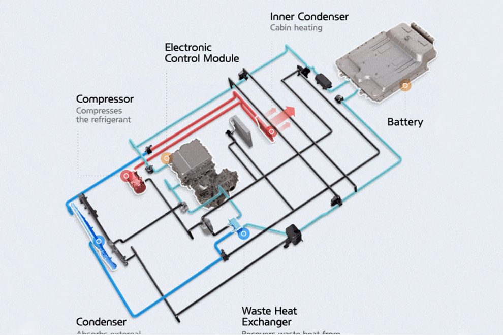Au lieu de produire directement de la chaleur, elle récupère l’énergie thermique présente dans l’air extérieur et dans les composants du véhicule.